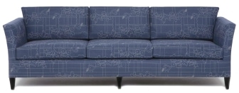 Panache and versatility. Selldorf devised this unique sofa early on and continues to use it at home. Wing-tipped pillows, tulipped arms and backrests define an inviting, character-driven silhouette. Tapered legs extend the arc at the rear with a flare, landing straight at the front. They are dark-stained hardwood with a satin coating. This ample, three-seater is tightly upholstered, unfurling for the eye. Adaptable to most upholstery specifications, the First Sofa compliments art and other furnishings and centers a seating arrangement equally well. It is made by hand, locally and to-order.