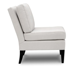 This design is an open invitation to sit. A wide, comfortable seat pitches back and springs to a confident upstroke. Perched on square tapered legs at the front, flared legs extend the arch of the back. Top and bottom welting accents both cushions, while the rear cushion is semi-attached so the effect is always neat and proportional. Silhouette presides. This chair is an early Selldorf design and enhances the versatility and character of the Cologne Collection. Alone or in a pair, the Liesel Chair accents a seating arrangement. It is handmade locally and to-order.