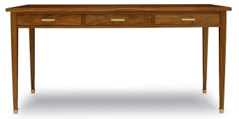 A walnut desk. This concise design emphasizes the character and feel of natural wood, expertly hand-oiled and waxed. Lustrous grain accents the desk’s rational line. A meticulous reprisal of a classic idea, designed to reward hand and eye. The table top is cut to a lean edge with an elegant overhang, while three slim drawers divide the undercarriage. Corner legs taper down to meet fine brass ferrules, supporting a writing surface which can be specially finished in leather. The Sebolt Desk is a choice companion to art and antiques, a notable member of the Cameo Collection. It is handmade locally, and to-order.